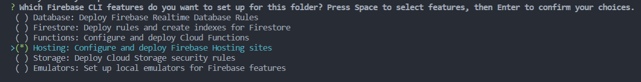 - Then in your terminal or cmd prompt, Firebase CLI will give multiple options like Realtime Database, Firestore, Analytics, Hosting, etc. In that select Hosting