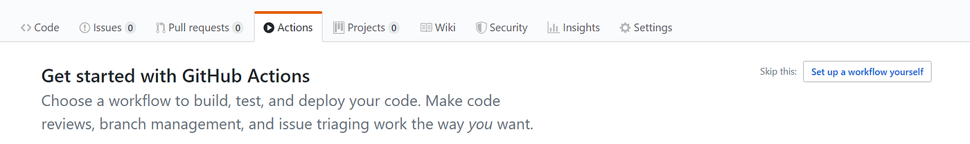 Go to your repository in GitHub and click on Action and then click on Set up a workflow yourself
